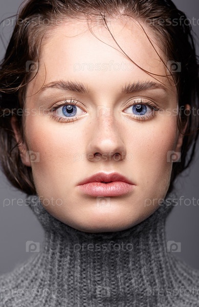 Портрет красоты молодой женщины в сером шерстяном свитере. Брюнетка с ярко-голубыми глазами и дневным женским макияжем