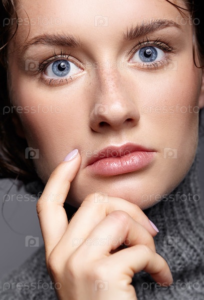 Портрет красоты молодой женщины в сером шерстяном свитере. Брюнетка с ярко-голубыми глазами и дневным женским макияжем