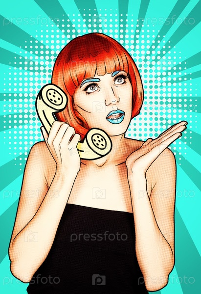 Портрет молодой женщины в стиле комического поп-арта. Женщина в красном парике на голубом мультяшном фоне звонит по телефону