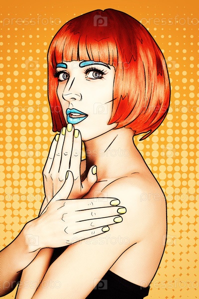 Портрет молодой женщины в стиле комического поп-арта. Женщина в красном парике на желто-оранжевом мультяшном фоне