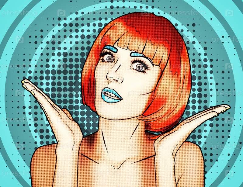 Портрет молодой женщины в стиле комического поп-арта. Женщина в красном парике на синем мультяшном фоне