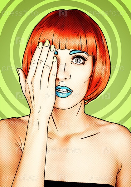 Портрет молодой женщины в стиле комического поп-арта. Женщина в красном парике на желтом мультяшном фоне