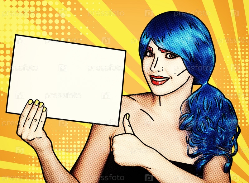 Портрет молодой женщины в стиле комического поп-арта. Женщина с бумагой в руках