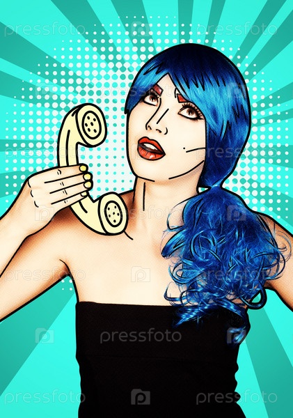 Портрет молодой женщины в стиле комического поп-арта. Женщина в синем парике на синем фоне звонит по телефону
