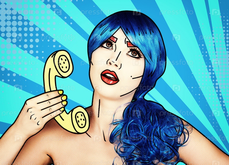 Портрет молодой женщины в стиле комического поп-арта. Женщина в синем парике на синем фоне звонит по телефону