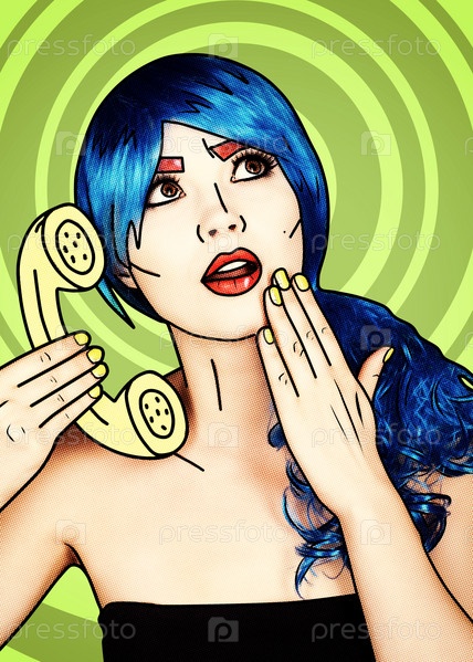 Портрет молодой женщины в стиле комического поп-арта. Женщина в голубом парике звонит по телефону