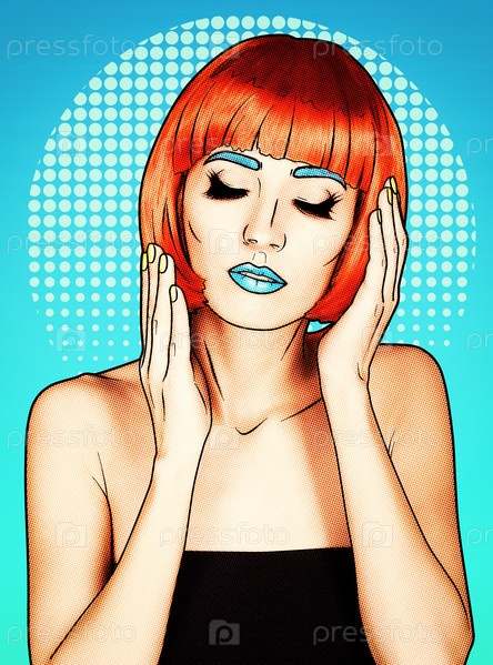 Портрет молодой женщины в стиле комического поп-арта. Женщина в красном парике на синем мультяшном фоне
