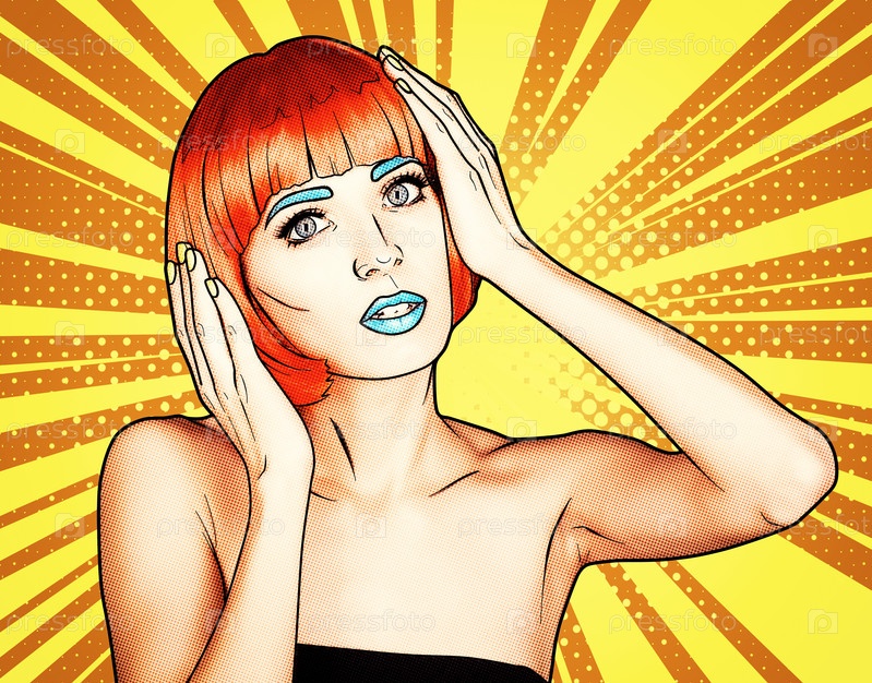 Портрет молодой женщины в стиле комического поп-арта. Женщина в красном парике на желто-оранжевом мультяшном фоне