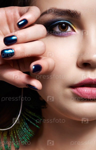 Портрет красивой брюнетки на черном фоне и серьгах из павлиньих перьев