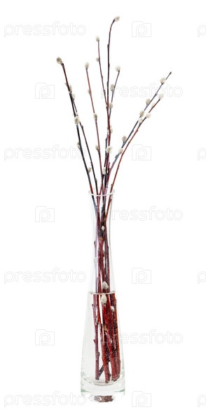 Веточки вербы в стеклянной вазе изолированы