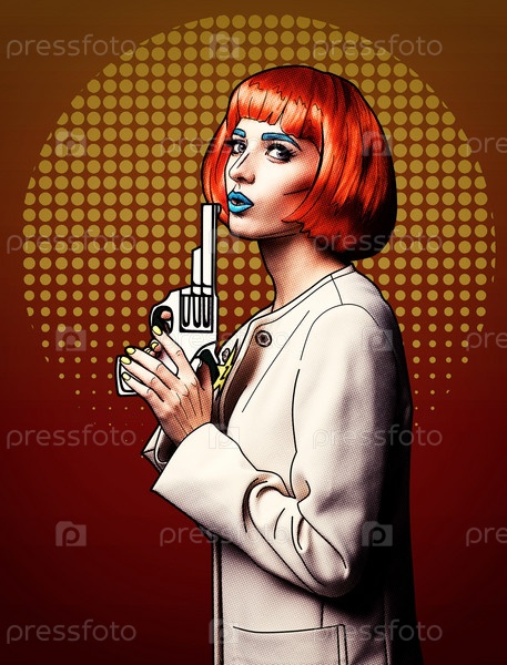 Портрет молодой женщины в стиле комического поп-арта. Женщина с пистолетом в руке