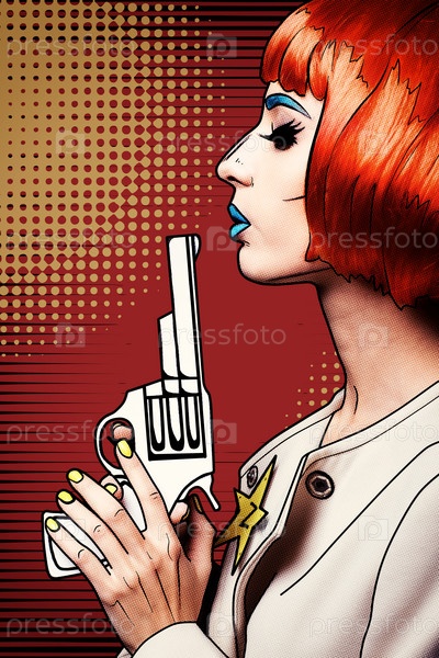 Портрет молодой женщины в стиле комического поп-арта. Женщина с пистолетом в руке