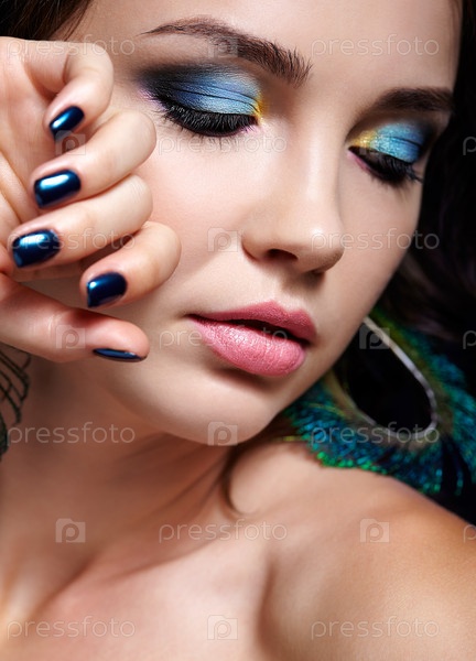 Портрет красивой брюнетки на черном фоне и серьгах из павлиньих перьев