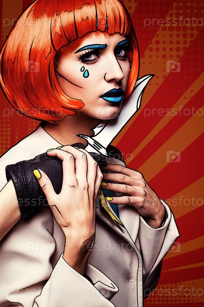 Женщина с ножом возле горла. Портрет молодой женщины в стиле комического поп-арта
