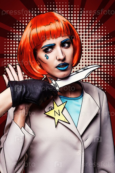 Женщина с ножом возле горла. Портрет молодой женщины в стиле комического поп-арта