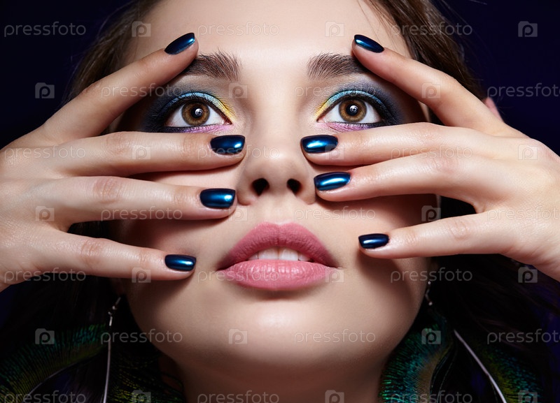 Портрет красивой брюнетки на черном фоне и серьгах из павлиньих перьев