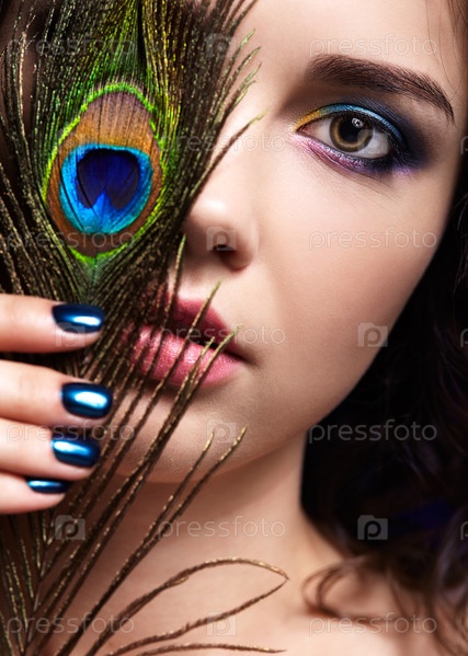 Портрет красивой брюнетки на черном фоне и павлиньим пером