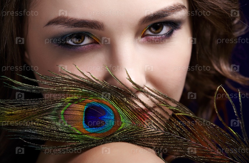 Портрет красивой брюнетки на черном фоне и павлиньим пером