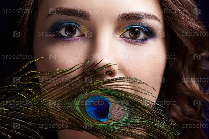Портрет красивой брюнетки на черном фоне и павлиньим пером