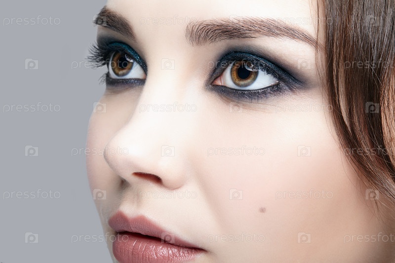 Макрос крупным планом человеческого женского лица. Женщина с естественным макияжем лица вечерней моды