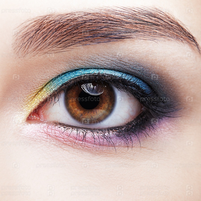 Крупный план макросъемки человеческого женского глаза. Девушка с идеальной кожей и сиренево-голубо-желтыми тенями для глаз
