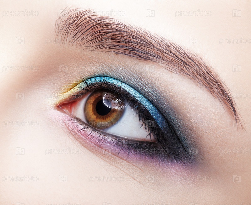 Крупный план макросъемки человеческого женского глаза. Девушка с идеальной кожей и сиренево-голубо-желтыми тенями для глаз