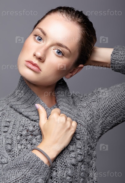 Портрет красоты молодой женщины в сером шерстяном свитере. Брюнетка с ярко-голубыми глазами и дневным женским макияжем