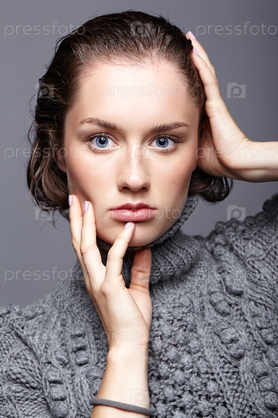 Портрет красоты молодой женщины в сером шерстяном свитере. Брюнетка с ярко-голубыми глазами и дневным женским макияжем