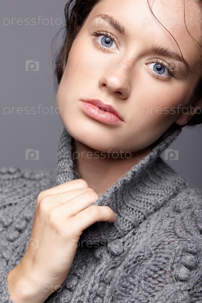 Портрет красоты молодой женщины в сером шерстяном свитере. Брюнетка с ярко-голубыми глазами и дневным женским макияжем
