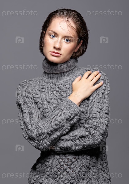 Портрет красоты молодой женщины в сером шерстяном свитере. Брюнетка с ярко-голубыми глазами и дневным женским макияжем