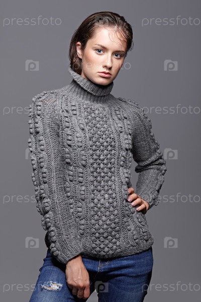 Портрет красоты молодой женщины в сером шерстяном свитере. Брюнетка с ярко-голубыми глазами и дневным женским макияжем