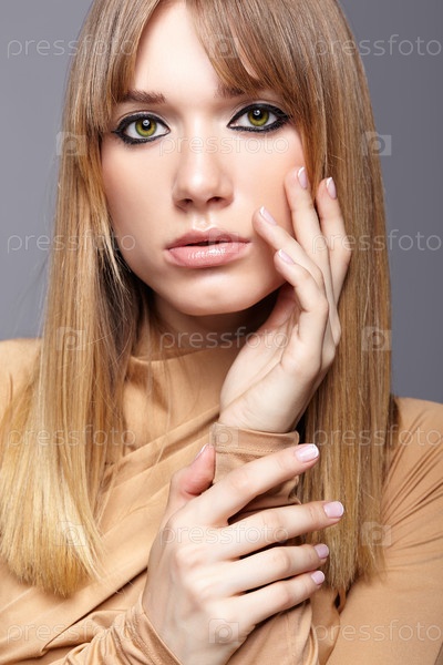 Портрет блондинки молодой женщины. Женщина с зелеными глазами и длинными волосами. Девушка в бежевом платье на сером фоне