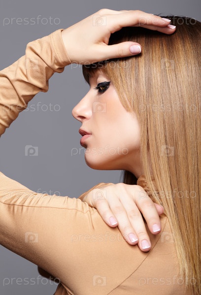 Портрет блондинки молодой женщины. Женщина с зелеными глазами и длинными волосами. Девушка в бежевом платье на сером фоне