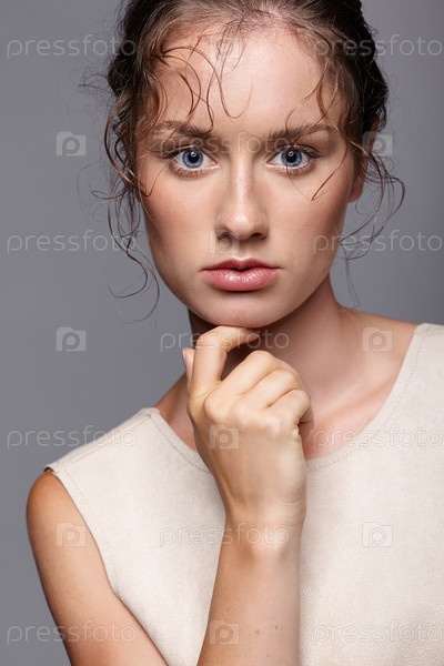 Портрет молодой женщины. Брюнетка с ярко-голубыми глазами и дневным женским макияжем на сером фоне