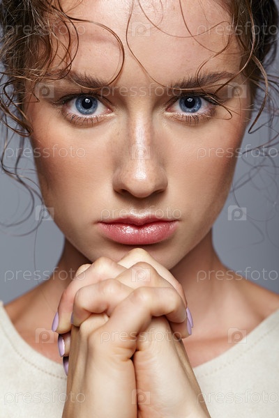 Портрет красоты молодой женщины. Брюнетка с ярко-голубыми глазами и дневным женским макияжем на сером фоне