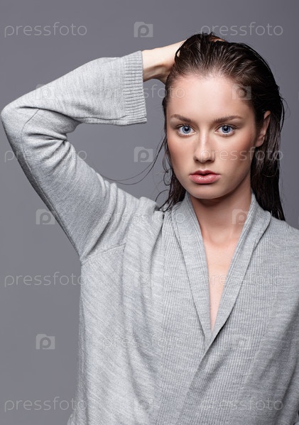 Портрет красоты молодой женщины в сером платье. Брюнетка с ярко-голубыми глазами и дневным женским макияжем
