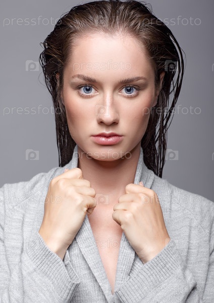 Портрет красоты молодой женщины в сером платье. Брюнетка с ярко-голубыми глазами и дневным женским макияжем
