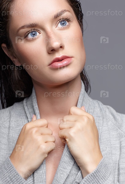 Портрет красоты молодой женщины в сером платье. Брюнетка с ярко-голубыми глазами и дневным женским макияжем