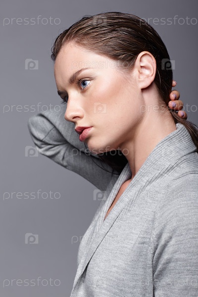 Портрет красоты молодой женщины в сером платье. Брюнетка с ярко-голубыми глазами и дневным женским макияжем