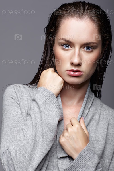 Портрет красоты молодой женщины в сером платье. Брюнетка с ярко-голубыми глазами и дневным женским макияжем