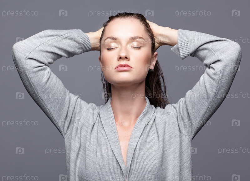 Портрет красоты молодой женщины в сером платье. Брюнетка с закрытыми глазами и дневным женским макияжем