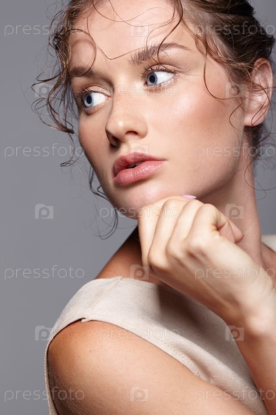 Портрет красоты молодой женщины. Брюнетка с ярко-голубыми глазами и дневным женским макияжем на сером фоне