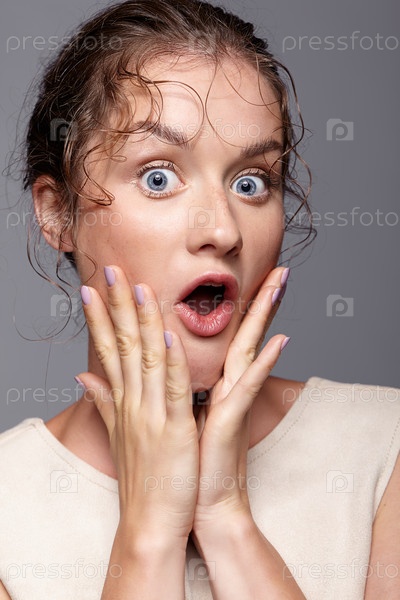 Изумленная молодая женщина с руками возле лица и открытым ртом