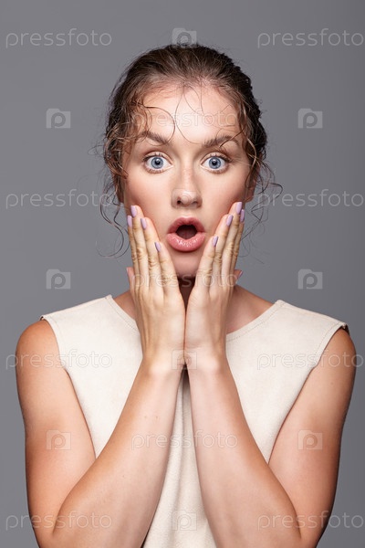 Изумленная молодая женщина с руками возле лица и открытым ртом