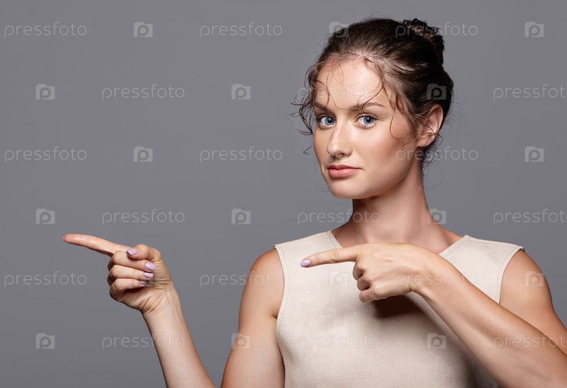 Красивая молодая женщина улыбается и указывает на пространство для копирования на сером фоне