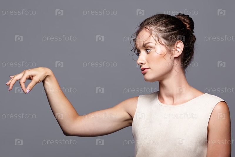 Молодая женщина показывает и представляет пространство для копирования пальцами