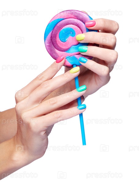 Женщина держит леденец в руках с ярким маникюром ногтей. Изолированные на белом фоне