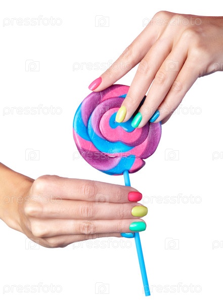 Женщина держит леденец в руках с ярким маникюром ногтей. Изолированные на белом фоне