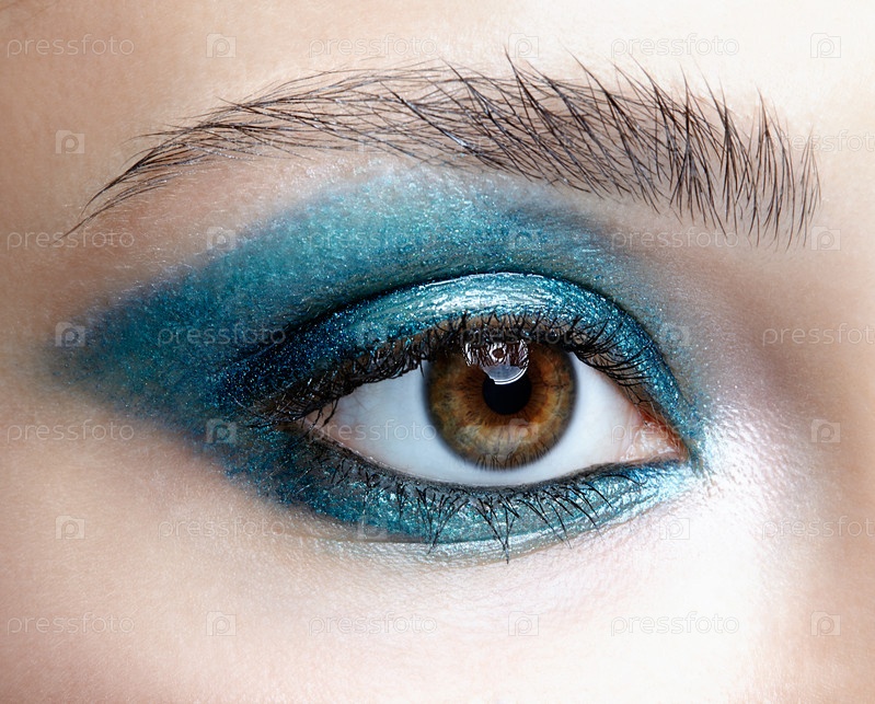 Крупный план макросъемки человеческого женского глаза. Девушка с идеальной кожей и сине-зелеными дымчатыми тенями для глаз