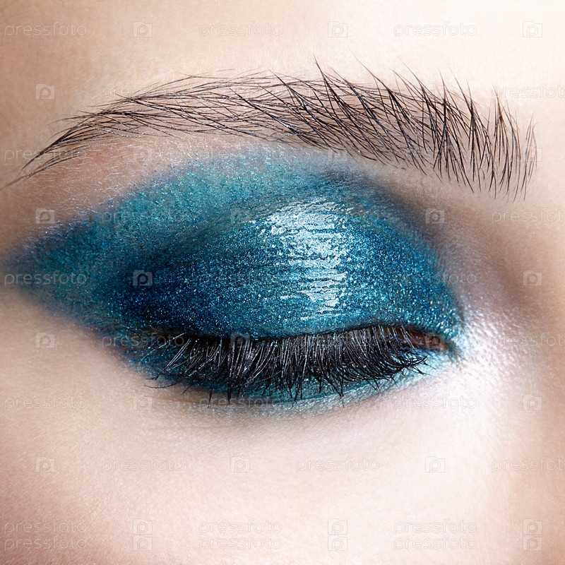 Крупный план макросъемки закрытого человеческого женского глаза. Девушка с идеальной кожей и сине-зелеными тенями